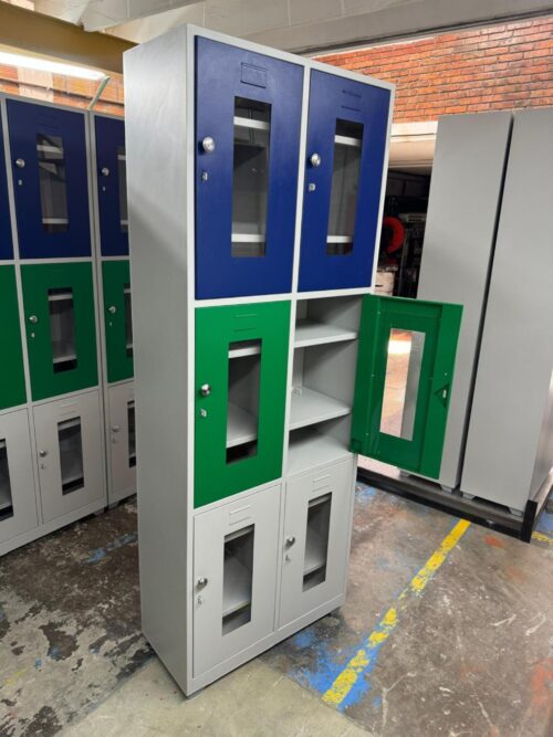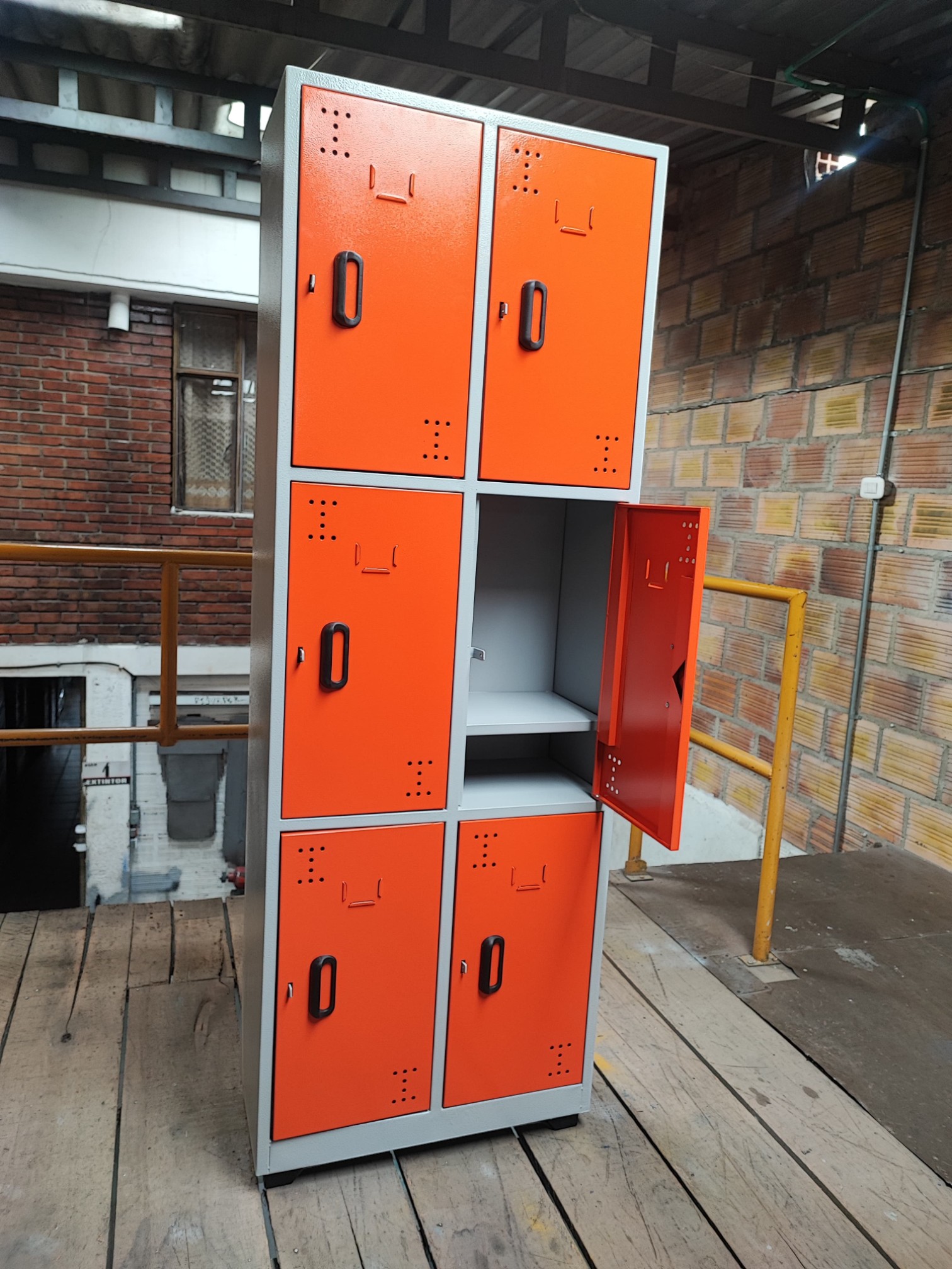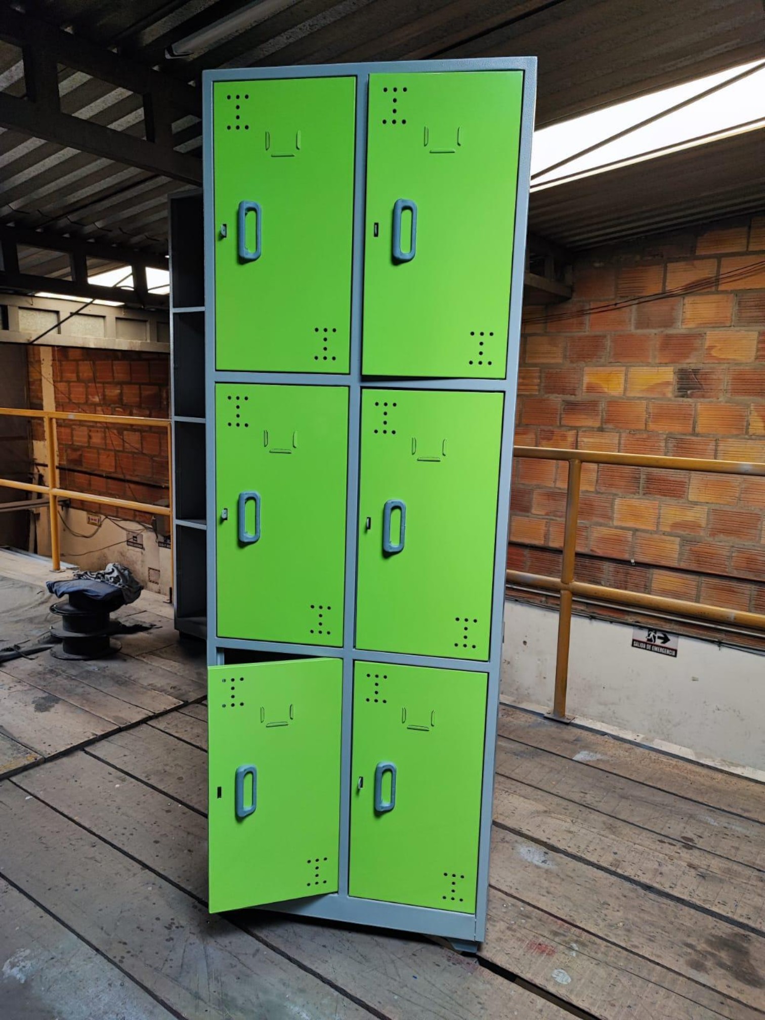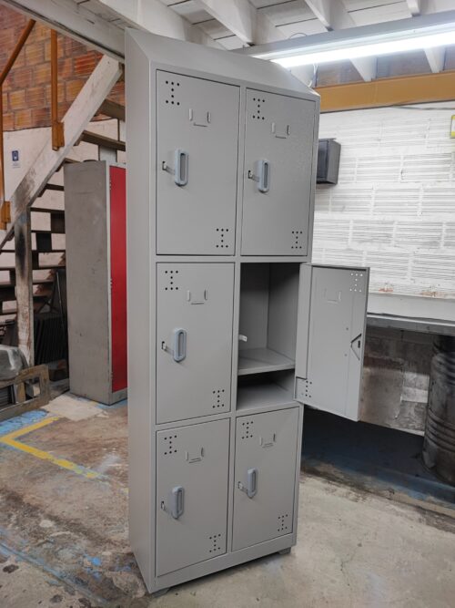 Fabricado en lamina col rolled, doblado en frio, cada compartimiento incluye division Horizontal las puertas son diseñadas con doble refuerzo,perforacion para ventilacion, manija plastica , porta rotulo y porta candado , los acabados son con terminacion en piura electroestatica a 200 grados